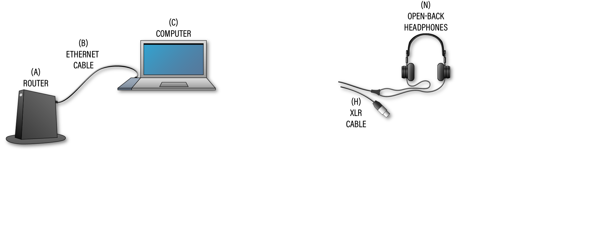 For each microphone, CONNECT: FMB Pro → XLR cable → in-line preamp → headworn condenser mic.